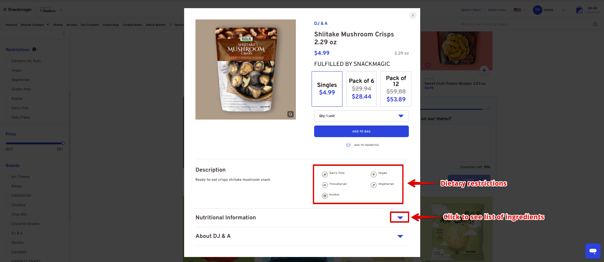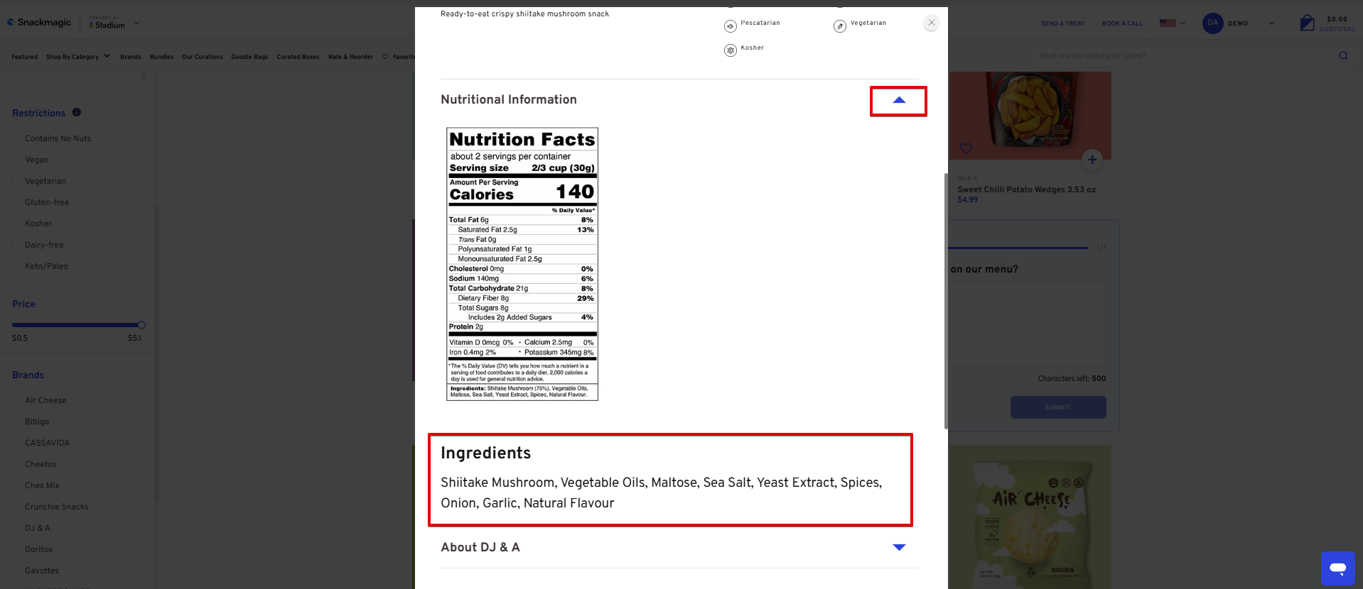 - For extra peace of mind, you can click on individual snack items to view more detailed ingredient information. This ensures you have full transparency about what's in your snacks and can confidently make selections that align with your dietary needs.