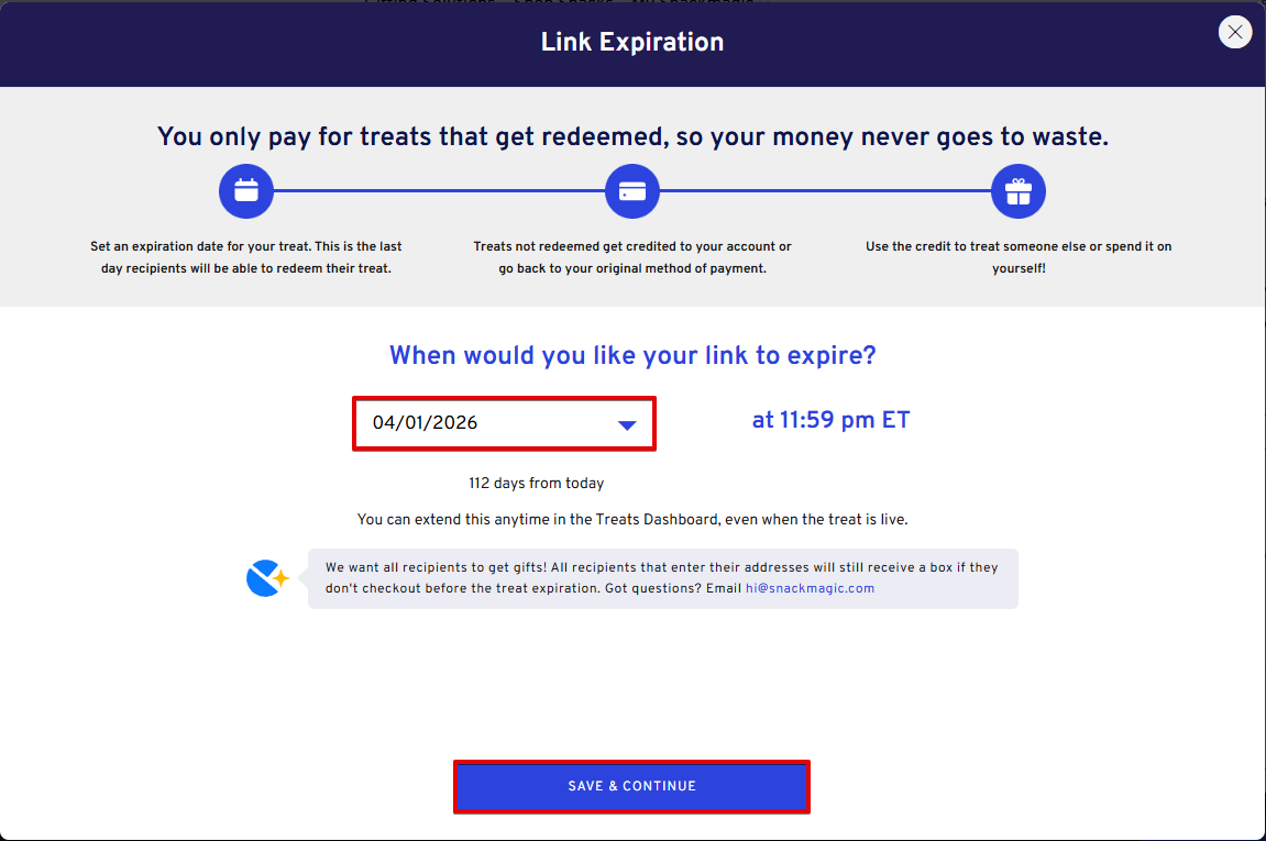 - Indicate a date when you want the order link to expire. This will be the last day that your recipients are allowed to redeem the treat.