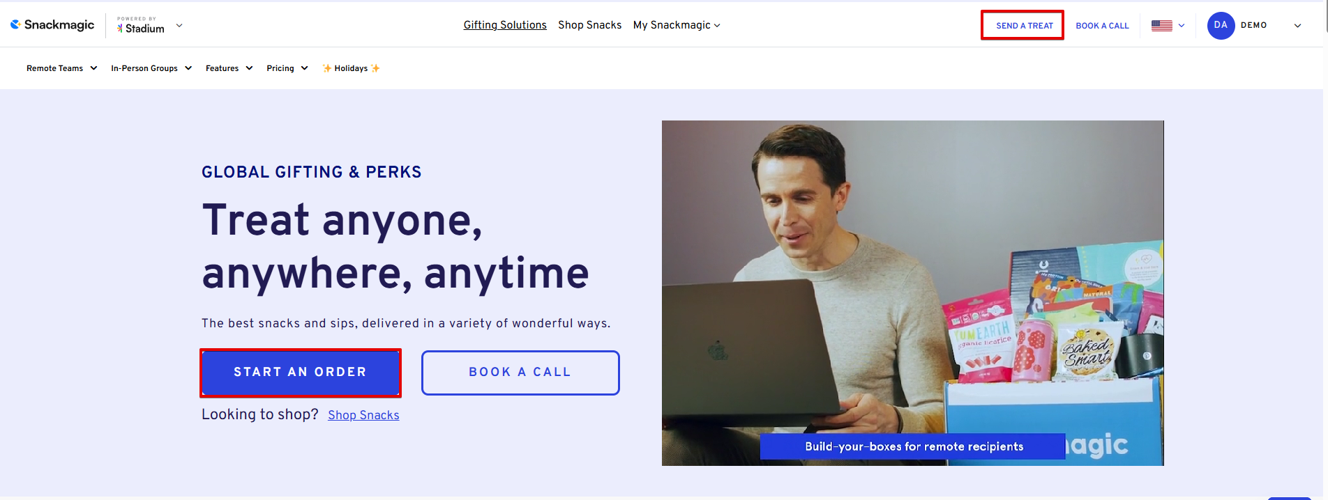 - After logging in to your account at snackmagic.com, click "START AN ORDER" or "SEND A TREAT."